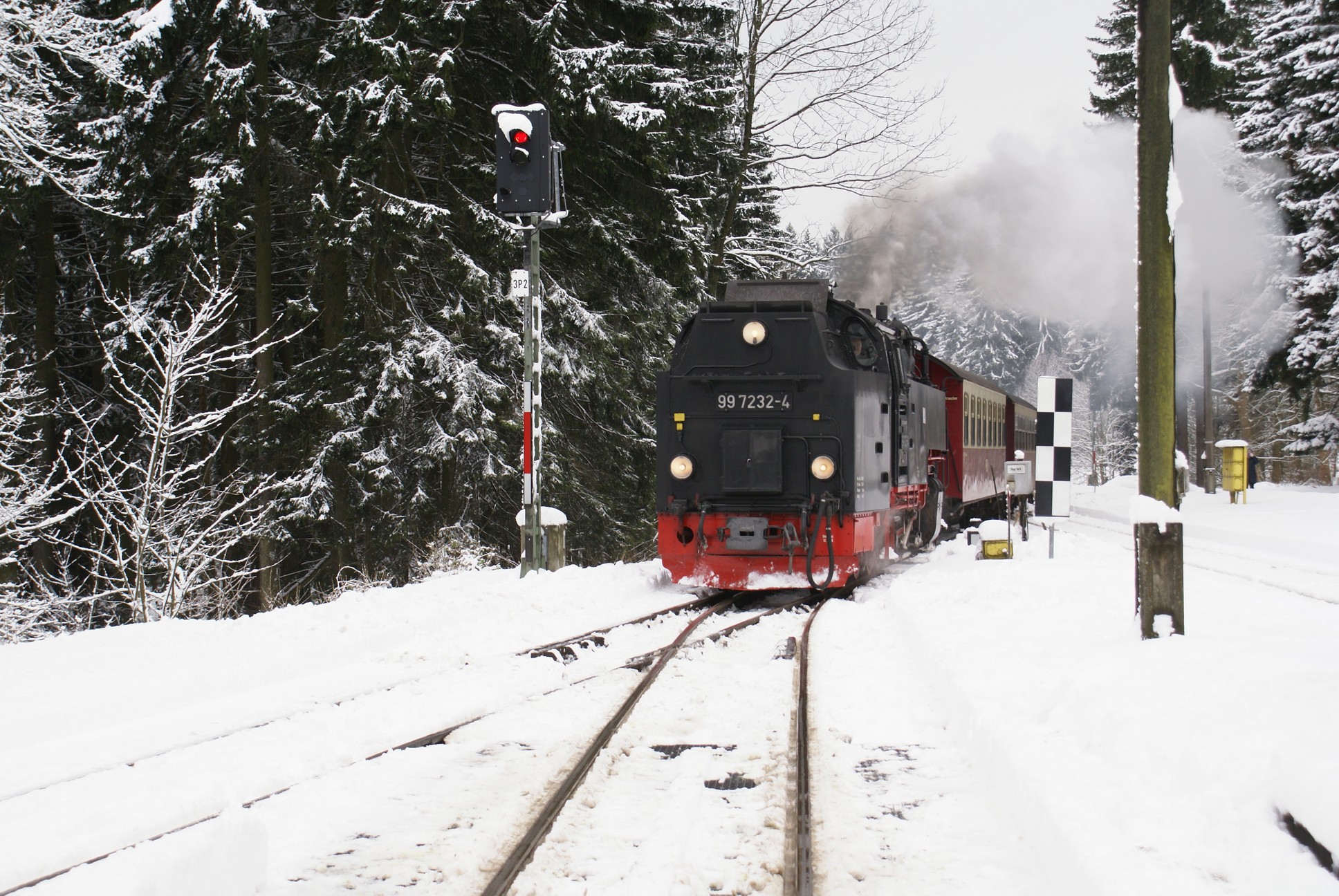 Dringend zu empfehlen ist für Autofahrer die Mitnahme von Schaufel und Besen zur Reinigung eines Parkplatzes! Der Winterdienst ist nämlich micht die besondere Stärke der Stadt Wernigerode!!! Bahnhof Drei Annen Hohne 99 7237 mit dem 8920 aus Nordhausen 99 7247 mit dem 8903 aus Wernigerode 99 7732 mit 8932 vom Brocken |